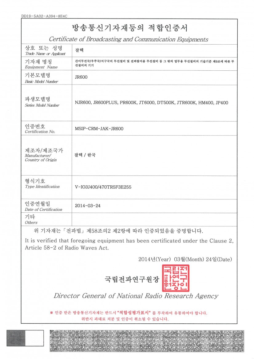 목록 [기타] 제품 인증서(JR-600SERIES) 작성자 잘텍 작성일 17-05-15 10:18 | 조회 59,803 | 댓글 0 본문 JR-600 SERIES 이전글다음글 댓글목록 0 등록된 댓글이 없습니다. 목록